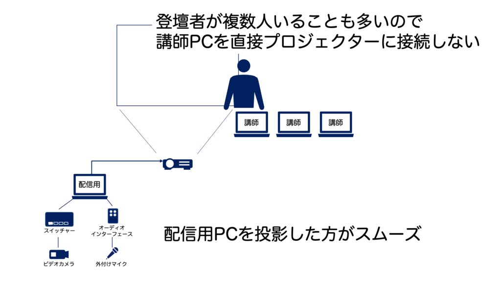 言ってること違うじゃん!と突っ込まれそうですけど、今までの説明はわかりやすく表現するためで、実際に現場でプロジェクターにつなぐPCは、配信用のPCにするのがコツです。