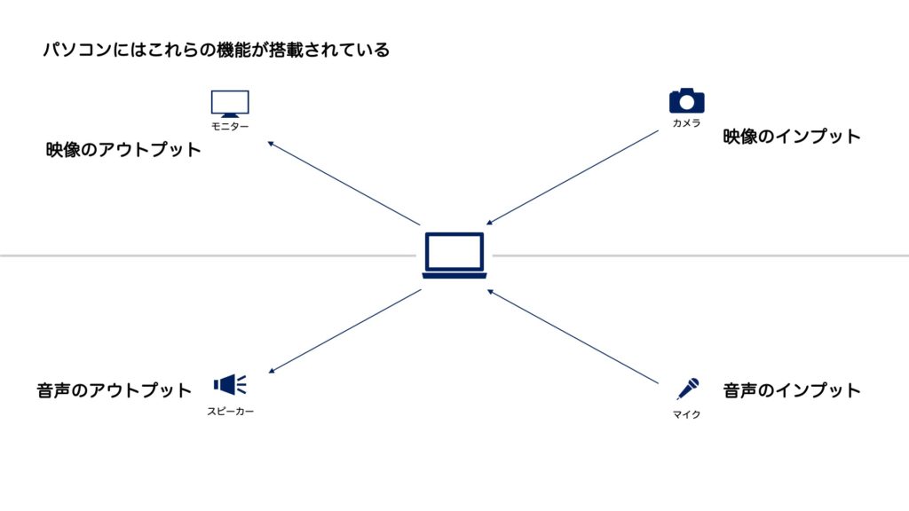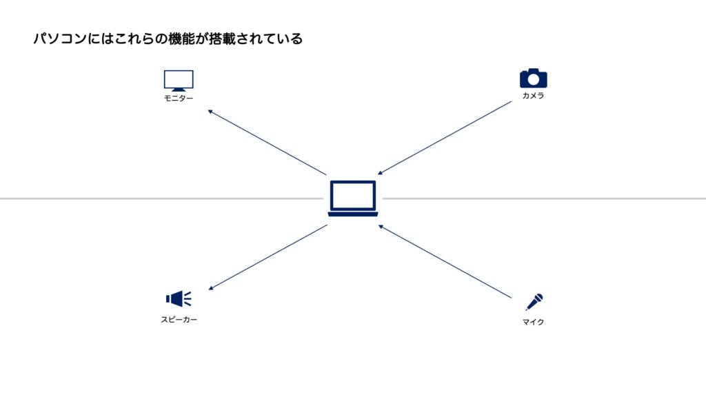 パソコンに内蔵されている映像系の機能は「カメラ」と「モニター」です。