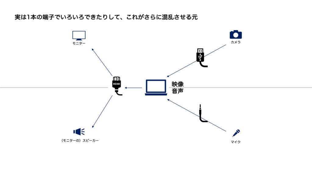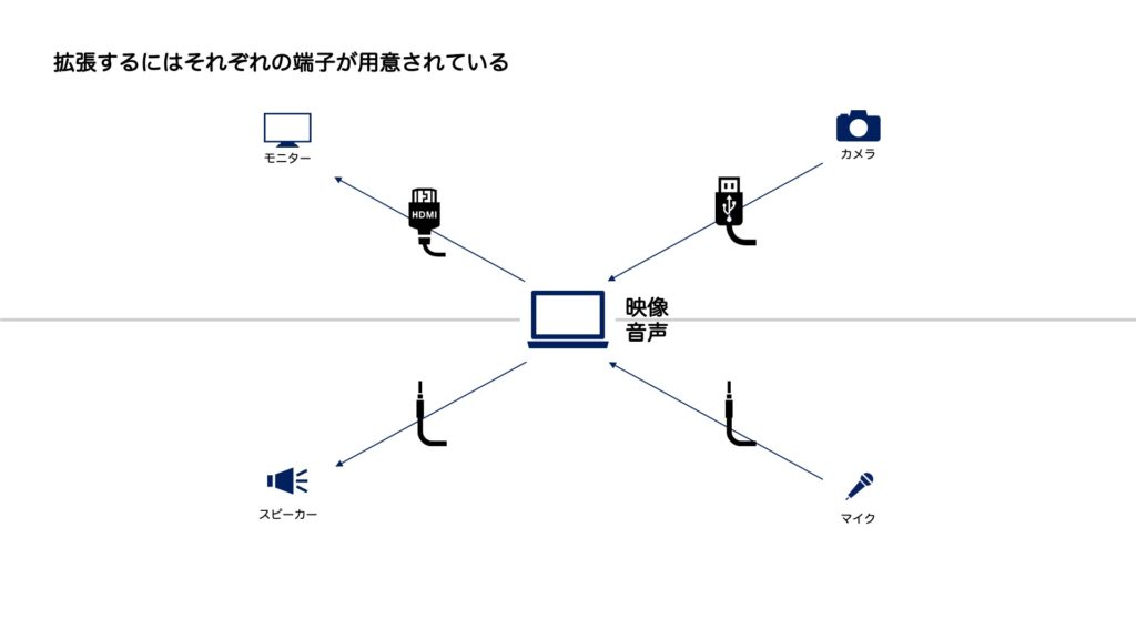 Zoom配信する場合、カメラ、マイク、モニター、スピーカーの機能を拡張させる必要が出てきます。この拡張がUSB端子に統一さえていればいいのですが、なぜだか全部バラバラです。
